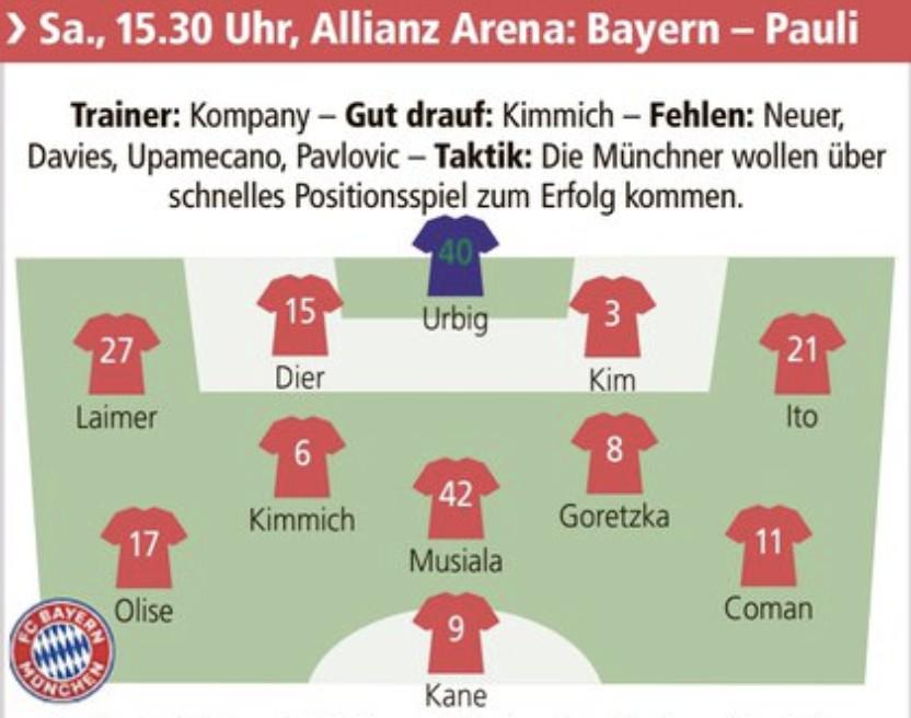 《慕尼黑日报》预测拜仁vs圣保利的首发阵容: